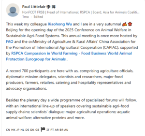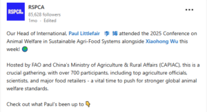 Promoting RSPCA-style welfare labels to Chinese farms.