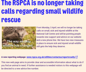 Although it states that larger animals such as swans will still be rescued, I can tell you that this is a lie. If you call the NCC, they take your details, then at the end after they have checked the number of jobs for resources in the area, they end the call by reading out a script off a screen informing you that “unfortunately at this time we cannot attend” or words to that effect. They then attempt to palm you off onto a vet, or ask you to find a wildlife centre.