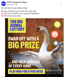 As a juxtaposition to this, here is the RSPCA attempting to make people gamble on their lottery to swell their coffers by using a swan and lying they “help animals of every kind”.